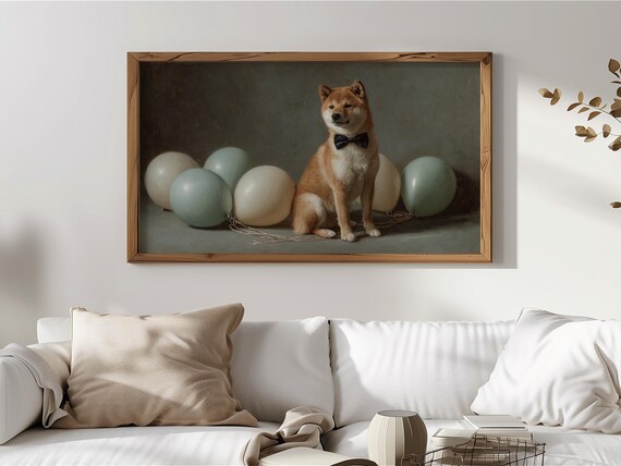 Classic Shiba Inu Decor TV Art, Vintage Pet Portrait, Neutral Shiba Dog Painting with Bow Tie, Cozy Wall Decor, Digital Download Art 260