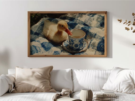 Thank you so much for visiting my shop. I hope you enjoy displaying this charming oil painting of a playful duckling nestled next to a delicate teacup on your Frame TV.