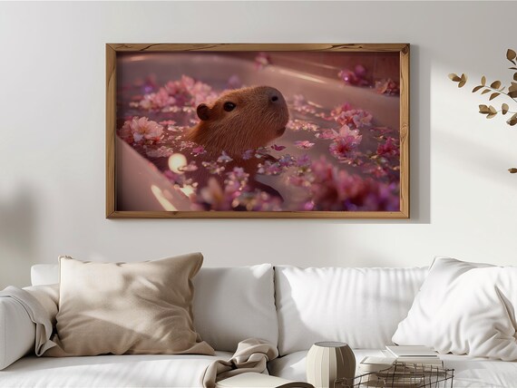 Samsung Frame TV Art: adorable capybara relaxing in a cozy bath surrounded by soft floral elements