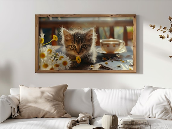 Thank you so much for visiting my shop. I hope you enjoy displaying this adorable fluffy kitten surrounded by delicate daisies and vintage teacups on your Frame TV.