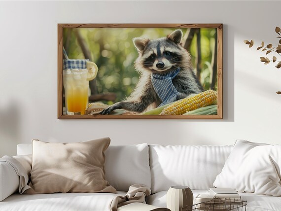 Cute Raccoon TV Art, Playful Harvest Decor, Rustic Farmhouse Art with Corn, Digital Download, Autumn Cozy Vibes, Digital Art 242