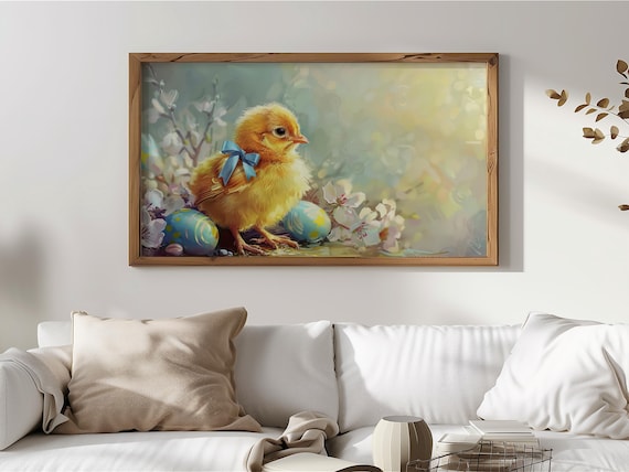 Samsung Frame TV Art: adorable yellow chick surrounded by delicate eggs and blooming flowers
