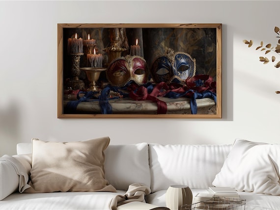 Dramatic Vintage TV Art, Venetian Carnival Masks, Luxurious Still Life Decor, Warm Candlelit Tones, Digital Download Frame TV Art 308