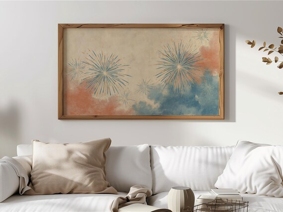 Samsung Frame TV Art: stunning watercolor depiction of vibrant fireworks illuminating a night sky