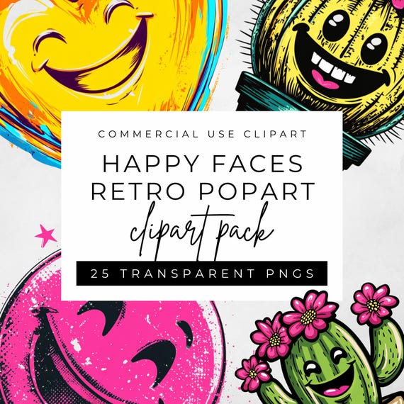 Happy Faces Retro Pop Art Clipart Pack – 25 PNG Images (300 DPI)