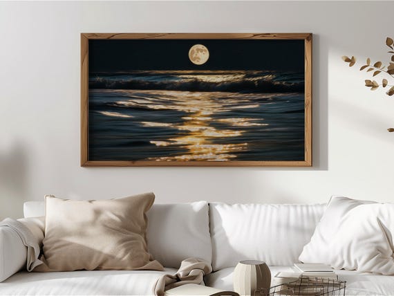 Samsung Frame TV Art: luminous full moon over a tranquil ocean landscape