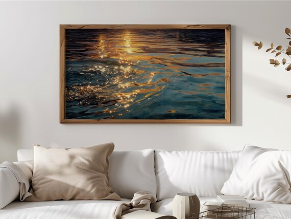 Moody Coastal Water Reflection Frame TV Art, Warm Golden Light, Luminous Realistic Art, Teal Blue Water Digital Download, Modern Decor 417