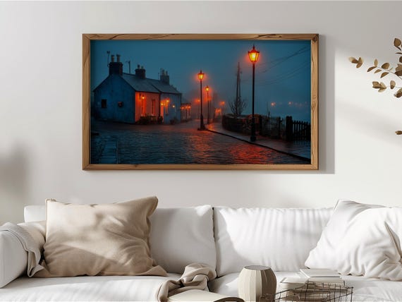 Thank you so much for visiting my shop. I hope you enjoy displaying this captivating depiction of a serene village illuminated by glowing lanterns, enveloped in a mystical mist on your Frame TV.