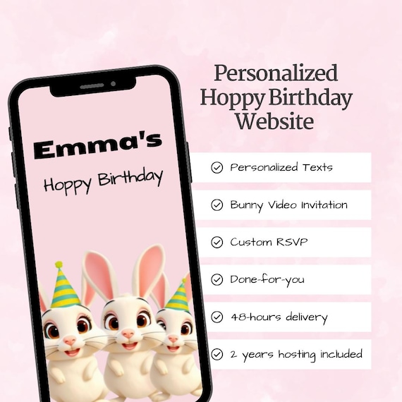 ✨ Make your child's birthday unforgettable with a done-for-you personalized birthday website, featuring an adorable bunny theme, a custom RSVP form, and a custom bunny video invitation! ✨