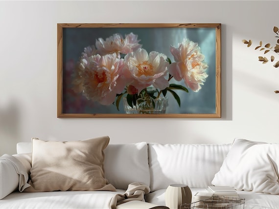 Romantic Floral Frame TV Art, Vintage Peony Bouquet, Feminine Pastel Wall Decor, Painterly Summer Flower Theme, Digital Download 433