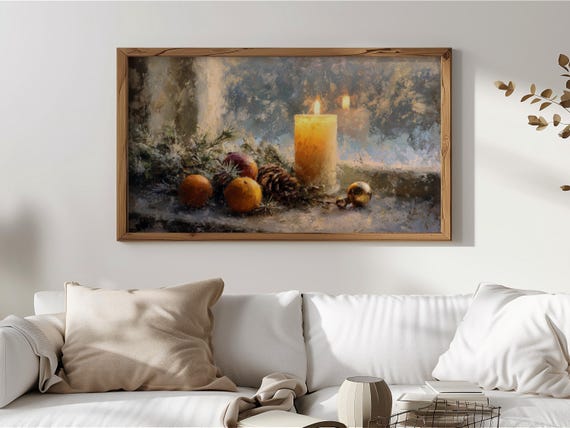 Rustic Christmas Candle Wall Art for Samsung Frame TV: cozy winter scene featuring a flickering candle and rustic pinecones