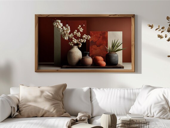 Rustic Frame TV Art, Earthy Terracotta Still Life, Ceramic Vases and Fruit TV Art, Warm Modern Rustic Neutral Decor, Digital Download 371