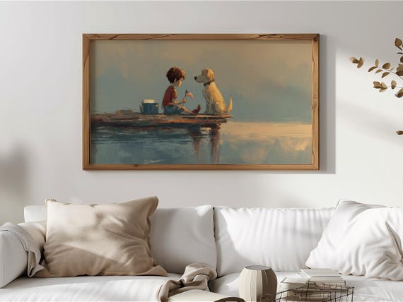 Thank you so much for visiting my shop. I hope you enjoy displaying this charming lakeside scene featuring a child and a dog on your Frame TV.