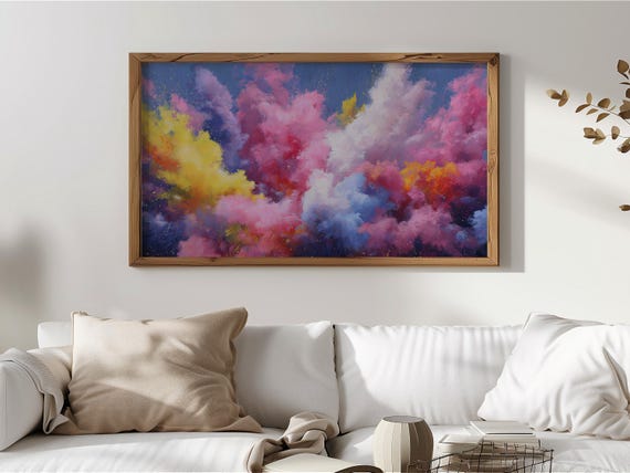 Samsung Frame TV Art: vibrant abstract painting featuring dynamic powder clouds in pink and blue hues