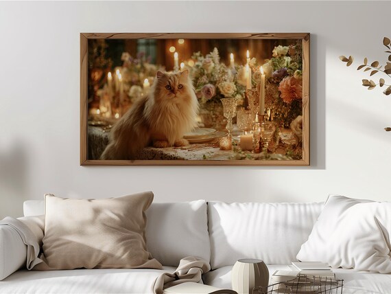 Samsung Frame TV Art: charming Persian cat elegantly seated at a beautifully set dinner table