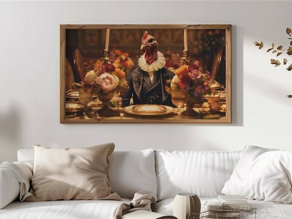 Vintage Thanksgiving TV Art, Turkey in Fine Suit Art for Samsung Frame TV, Festive Banquet Scene, Digital Download, Quirky Fall Decor 232